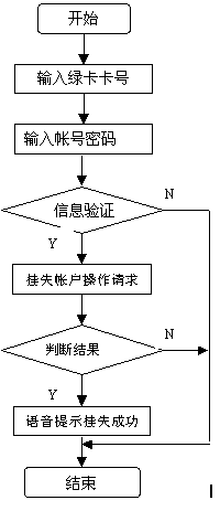 此功能為用戶提供賬號(hào)臨時(shí)掛失業(yè)務(wù),使用戶的損失減到最小。 用戶通過特定的接入碼進(jìn)入呼叫中心,選擇賬戶掛失后,呼叫中心語(yǔ)音提示用戶輸入帳號(hào)密碼,平臺(tái)將用戶的數(shù)據(jù)送至金融主機(jī)系統(tǒng),然后根據(jù)返回的信息將處理結(jié)果語(yǔ)音提示給用戶。用戶臨時(shí)掛失后,還必須到營(yíng)業(yè)前臺(tái)進(jìn)行正式的掛失操作。流程圖如下圖。