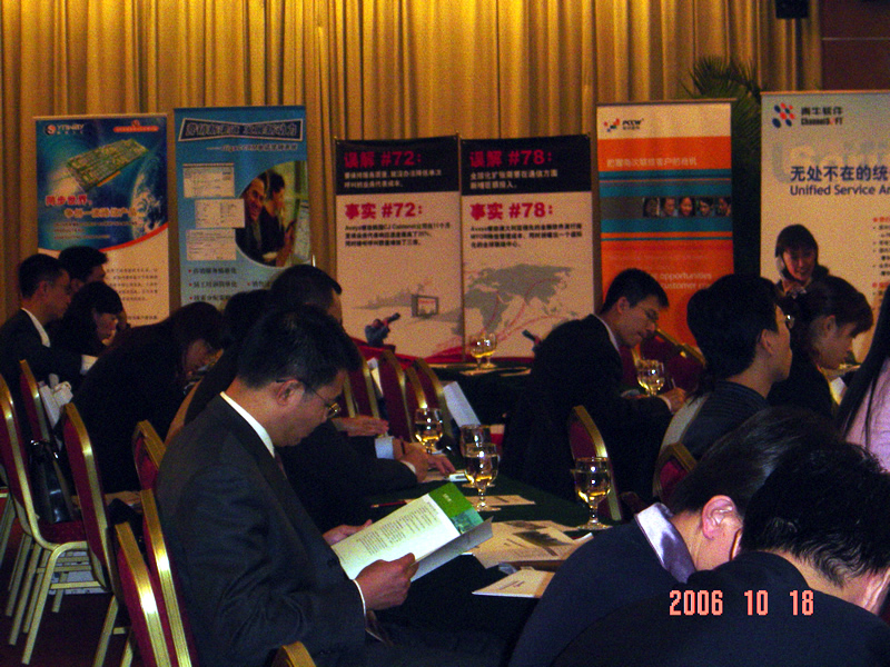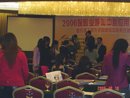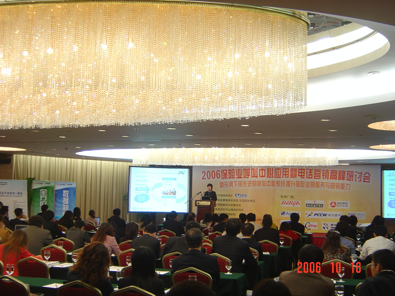 。。2006年10月18日,2006保險(xiǎn)業(yè)呼叫中心應(yīng)用暨電話營(yíng)銷高峰研討會(huì)在北京天鴻科園大酒店隆重召開(kāi),以下是會(huì)議現(xiàn)場(chǎng)的相關(guān)圖片報(bào)道: