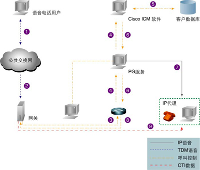 (1)一個(gè)客戶通過PSTN發(fā)出一個(gè)基于TDM平臺(tái)的呼叫。(2)企業(yè)聯(lián)絡(luò)中心的VoIP網(wǎng)關(guān)收到這一呼叫,并把它從TDM形式轉(zhuǎn)換為IP形式。(3)該VoIP網(wǎng)關(guān)發(fā)出一個(gè)路由申請,包括撥號(hào)號(hào)碼等給Cisco