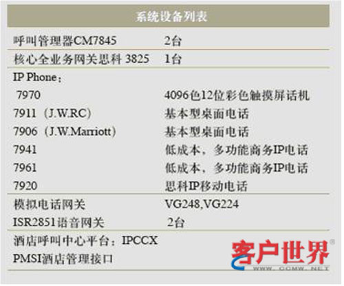 目前整個(gè)酒店IP電話系統(tǒng),采用兩個(gè)7845Call Manger,提供互相冗余備份。一套PMSI酒店管理接口,酒店呼叫中心平臺(tái):IPCCX,兩臺(tái)ISR2851語音網(wǎng)關(guān)。酒店還為每個(gè)客房提供一部7970彩屏IP終端,同時(shí)為了顧客的方便還在床頭還提供一部7906或者7911IP電話終端,足見酒店的體貼周到。酒店辦公管理和客服中心分別使用7941和7961,同時(shí)為了移動(dòng)方便,酒店還采用了Wi-Fi設(shè)計(jì),目前在酒店后臺(tái)管理采用了7920無線IP電話終端。