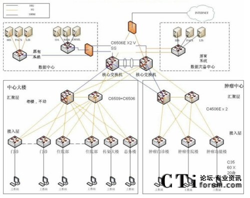 4506E作為新腫瘤大樓的匯聚層和整個(gè)醫(yī)院的小災(zāi)備中心,并上連至核心交換機(jī)以節(jié)約投資成本,而接入層繼續(xù)采用思科Catalyst 3560交換機(jī),既方便了管理,也為日后無(wú)線網(wǎng)絡(luò)的部署作好了準(zhǔn)備。(網(wǎng)絡(luò)拓?fù)鋱D如下)