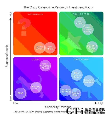 通過(guò)思科CROI矩陣對(duì)網(wǎng)絡(luò)犯罪類型的分析,思科安全專家預(yù)測(cè):在2011年,以獲得非法利益為目的的網(wǎng)絡(luò)犯罪將會(huì)分流他們的資源。