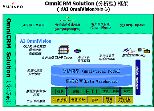 OmniCRM方案是亞信基于多年服務(wù)電信市場(chǎng)的豐富的行業(yè)經(jīng)驗(yàn),以及對(duì)國(guó)內(nèi)運(yùn)營(yíng)商業(yè)務(wù)發(fā)展的深刻認(rèn)識(shí)而推出的,其中,AI OmniVision是OmniCRM方案中經(jīng)營(yíng)分析型CRM 的核心產(chǎn)品。AI OmniVision不僅符合行業(yè)業(yè)務(wù)規(guī)范,而且基于對(duì)客戶行為、競(jìng)爭(zhēng)環(huán)境,商業(yè)獲利率以及其他參數(shù)的透徹分析,能夠使運(yùn)營(yíng)商充分了解現(xiàn)有客戶、識(shí)別并關(guān)注贏利的客戶組、提高服務(wù)質(zhì)量、確?蛻魸M意度和忠誠(chéng)度;同時(shí)吸引潛在的客戶;加強(qiáng)提供新服務(wù)的投資回報(bào)率;提高效率、減小成本,以實(shí)現(xiàn)業(yè)務(wù)價(jià)值的最大化。AI OmniVision采用數(shù)據(jù)倉(cāng)庫(kù)、ETL、OLAP分析、靈活報(bào)表展現(xiàn)及數(shù)據(jù)挖掘等技術(shù),包含了用戶分析、業(yè)務(wù)分析、收益分析、大客戶分析、營(yíng)銷分析、競(jìng)爭(zhēng)分析、服務(wù)質(zhì)量、新業(yè)務(wù)分析等眾多功能模塊。