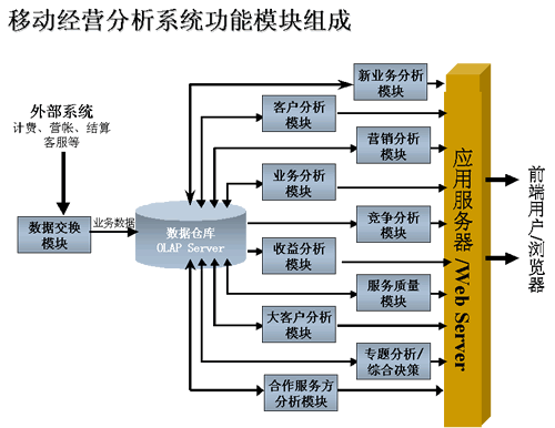 根據(jù)中國(guó)移動(dòng)的業(yè)務(wù)特征,AI OmniVision分為用戶分析、業(yè)務(wù)分析、收益分析、大客戶分析、營(yíng)銷分析、競(jìng)爭(zhēng)分析、服務(wù)質(zhì)量分析和綜合決策分析。同時(shí)在系統(tǒng)中還需要一些輔助模塊,以保證系統(tǒng)正常順利地運(yùn)行。這些輔助模塊包括: