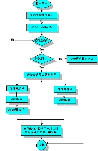 用戶連續(xù)三次輸入錯誤,則服務(wù)終止。用戶輸入帳號密碼正確,則系統(tǒng)查詢用戶帳號上的資金,資金足夠,則系統(tǒng)繼續(xù)提示:"普通門診按1,專家門診按2"。