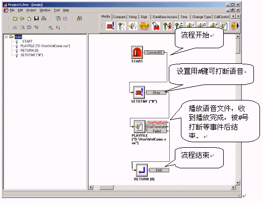 速能呼叫中心中間件的IVR流程開發(fā)接口簡(jiǎn)單易學(xué),編寫人員并不需要了解底層的實(shí)現(xiàn)原理、Dialogic硬件等知識(shí),而將精力完全放在業(yè)務(wù)開發(fā)上即可。