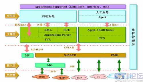 NGSP提供面向PSTN/PLMN/NGN/3G網絡的全套解決方案,它負責對各種底層網絡資源的匯聚和封裝,并且對外提供各種開放的符合NGCC規(guī)范的接口,為業(yè)務的開發(fā)提供創(chuàng)作平臺。從結構上看,SoftACD分為接入層、支撐層、應用層等三個功能模塊: