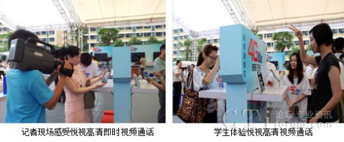 這次在廣州大學(xué)城開展的發(fā)布會,吸引了很多在校大學(xué)生的參加,下圖是記者和學(xué)生現(xiàn)場體驗(yàn)通過悅視高清視頻通話玩即時猜拳游戲,傳輸?shù)乃挟嬅娣浅G逦鲿,悅視產(chǎn)品的優(yōu)質(zhì)體驗(yàn)讓人享受無線高質(zhì)量流媒體服務(wù)的同時深刻感受到TD-LTE高帶寬、低時延的優(yōu)勢。