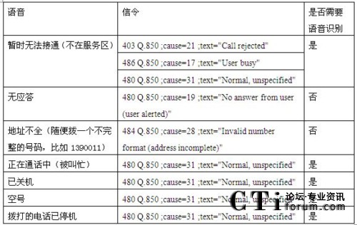 從歸納的情況看,只有無(wú)應(yīng)答和地址不全兩種情況是可靠信令分析來(lái)識(shí)別的,其他的5種情況都無(wú)法通過(guò)信令檢測(cè)識(shí)別。特別是暫時(shí)無(wú)法接通的語(yǔ)言提示,播放完提示音有3種不同的信令,應(yīng)該是屬于不同的情況,但是放了相同的語(yǔ)音。因此造成號(hào)碼識(shí)別錯(cuò)誤的現(xiàn)象。
