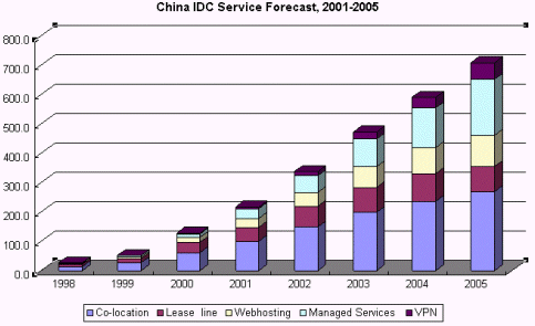 Frost & Sullivan研究表明,在2000年,中國(guó)IDC市場(chǎng)規(guī)模約為1億2千萬(wàn)美圓,預(yù)測(cè)到2005年,將達(dá)到7億美圓。從2000年到2005年間,中國(guó)IDC市場(chǎng)的年平均復(fù)合增長(zhǎng)率將達(dá)42.3% 。