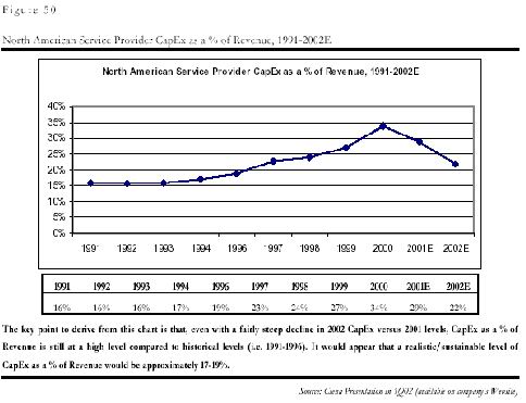 和中國的問題一樣,制造商的問題是電信服務(wù)企業(yè),即運營商的投入減少造成的。由于上世紀(jì)末互聯(lián)網(wǎng)和電子商務(wù)泡沫的虛假繁榮的影響,各運營商都嚴(yán)重高估了市場需求,認(rèn)為需求是會隨著通信能力的增強無限增加,因此市場規(guī)模是會無限擴張的,他們在缺乏對最終用戶需求的深入分析的前提下,普遍在基礎(chǔ)設(shè)施的建設(shè)上進行了超大規(guī)模的投入,其基礎(chǔ)設(shè)施建設(shè)投入在收入中的比例一度在2000年從平均的15%達(dá)到了創(chuàng)記錄的35%!