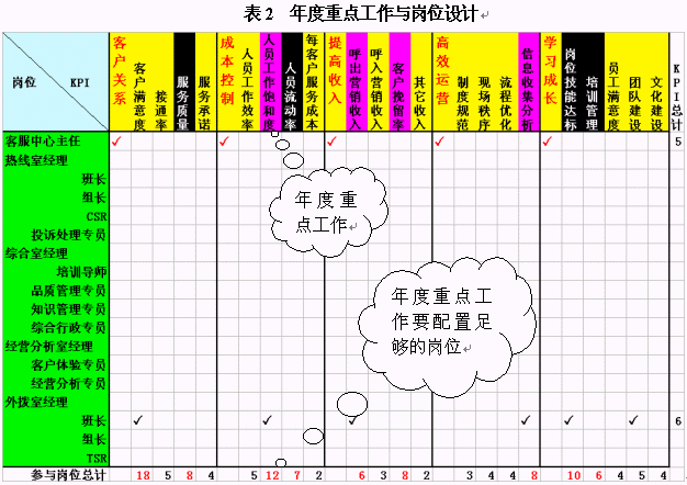 在這里,我們先以崗位設(shè)計來舉例。經(jīng)常有呼叫中心主管把每個崗位的職責(zé)都設(shè)計的非常詳細,包括了每天來做什么,說什么,錄入什么,甚至是打掃某區(qū)域衛(wèi)生之類。但是,我看遍了每一條,也沒找到這個崗位應(yīng)該對什么業(yè)績"負責(zé)任",該對哪些工作做出貢獻。此處建議各位把效益評價體系、年度重點工作與崗位設(shè)計結(jié)合起來。如表2所示,我們可以把效益評價體系作為KPI放在橫坐標(biāo)中,而崗位設(shè)置則是縱坐標(biāo)。每個崗位對應(yīng)的行中,可以勾畫其應(yīng)負責(zé)或者做出主要貢獻的項目。這些項目不能超過6個,因為太多的項目會使得這個崗位無所適從,最終的結(jié)果是哪個也沒做好。當(dāng)你勾畫完成之后,請計算每列的"對勾"數(shù)目,看看你本年度的重點工作是不是有較多崗位負責(zé)呢?
