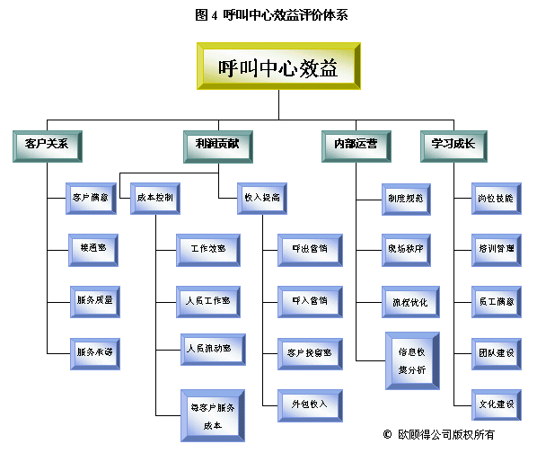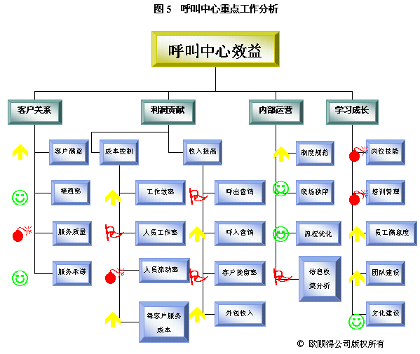 根據(jù)年度重點工作及目標(biāo),我們就可以設(shè)計關(guān)鍵措施來使其實現(xiàn)。通常一項關(guān)鍵措施可以有助于幾個目標(biāo)的達成。如建立培訓(xùn)體系,可以使得在崗培訓(xùn)、上崗培訓(xùn)、多技能訓(xùn)練以及崗位技能達標(biāo)率有所提升,而體現(xiàn)在業(yè)務(wù)上的效果則是服務(wù)質(zhì)量的提升、呼出營銷收入增加和客戶挽留率提高。