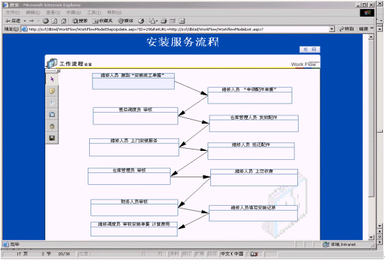 工作流程是指企業(yè)或公司的某種工作按照特定規(guī)范的流程在計算機上實現(xiàn)流轉(zhuǎn)的過程,工作流程由步驟、行為、行為處理、崗位的設(shè)置、權(quán)限設(shè)置等基本元素組成,主要對維修和回訪的流程進(jìn)行管理。