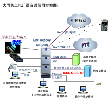 大同第二發(fā)電廠二期擴(kuò)建需要建設(shè)一個(gè)新的語(yǔ)音交換系統(tǒng),既用于電廠內(nèi)行政通信,又可以成為廠內(nèi)和公網(wǎng)語(yǔ)音通信匯接中心。