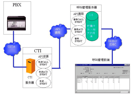 一般來說,各大有能力推出PBX產(chǎn)品的通訊廠商都有自己專用的呼叫管理系統(tǒng)。這些專用的呼叫管理系統(tǒng)可以直接從PBX獲取最高效的消息,而不用通過CTI SERVER。當(dāng)然,這些專用的呼叫管理系統(tǒng)也只能應(yīng)用于專門的PBX產(chǎn)品。 如果運(yùn)營(yíng)商在選購(gòu)設(shè)備的時(shí)候,已經(jīng)選購(gòu)了專用的呼叫管理系統(tǒng),那么開發(fā)商可以對(duì)這個(gè)專門的呼叫管理系統(tǒng)進(jìn)行二次開發(fā)。請(qǐng)看下面的數(shù)據(jù)流程圖: