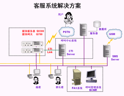 - 采用AVAYA S8300交換機做為客戶服務中心的核心電話接入平臺,系統(tǒng)中配置CTI接口模塊和內(nèi)置的自動呼叫分配軟件包。