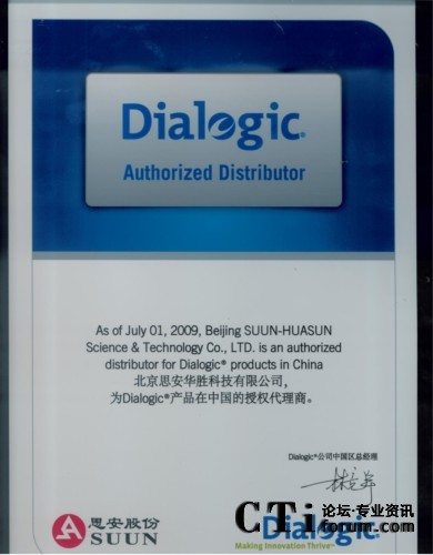 2009年7月1日DIALOGIC公司為其大陸地區(qū)DIALOGIC產(chǎn)品總代理-------北京思安華勝科技有限公司頒發(fā)了09版的代理證書(shū),新的代理證書(shū)不僅在版面和內(nèi)容上與以往有所不同,更重要的是說(shuō)明了代理的產(chǎn)品范圍(由于新近收購(gòu)的NMS、Cantata等產(chǎn)品,國(guó)內(nèi)原來(lái)就有代理商,現(xiàn)在所有產(chǎn)品都在Dialogic旗下,為了避免發(fā)生混淆和誤會(huì),本次的代理證書(shū)增加了附頁(yè),附頁(yè)里面規(guī)定了代理商所代理的產(chǎn)品的范圍,我們歡迎朋友們以各種形式來(lái)我公司或Dialogic公司北京代表處咨詢和驗(yàn)證)。此舉強(qiáng)調(diào)了渠道的正規(guī)性和權(quán)威性,北京思安華勝公司目前是DIALOGIC公司原DIALOGIC系列產(chǎn)品在中國(guó)的唯一總代理,承擔(dān)著Dialogic系列產(chǎn)品的銷售、市場(chǎng)推廣、技術(shù)支持、售后服務(wù)、保修服務(wù)等一系列重要工作。