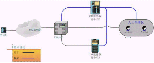 上圖是客服中心較常見的結(jié)構(gòu)圖,相當于將初級客服的CT-Server服務器一分為三。原來的語音板卡由現(xiàn)在真正的PBX替代,青牛USE和青牛ATS則是從CT-Server軟件包中獨立出來,強化各自的核心功能,運行在兩臺單獨的服務器上(IVR服務器還是需要語音板卡來處理話路,但語音板卡已經(jīng)不負責PBX的交換功能了)。這種類型的客服中心可以給客戶更大規(guī)模的、更穩(wěn)定的服務,并且撥入電話的客戶感覺不到系統(tǒng)的變化。
