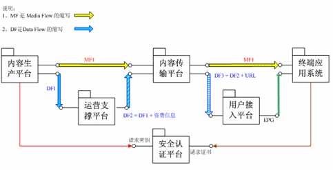 系統(tǒng)根據(jù)功能可分成內(nèi)容制作、節(jié)目傳輸、安全認(rèn)證、計費營業(yè)、接入處理和終端六個部分。整個系統(tǒng)始終貫穿媒體流和數(shù)據(jù)流,確保各個部分能夠有效的協(xié)作。