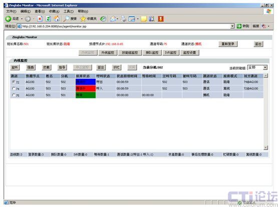3.模塊界面劃分清晰:Monitor監(jiān)控模塊分為內(nèi)線監(jiān)控、外線監(jiān)控、虛通道監(jiān)控、技能組監(jiān)控和IVR監(jiān)控共五大類。各類別功能獨(dú)立運(yùn)行,可根據(jù)企業(yè)對(duì)聯(lián)絡(luò)中心班長的職責(zé)劃分,對(duì)各類技能組、項(xiàng)目組的班長登錄提供有區(qū)別的監(jiān)控頁面,從而為每位班長的恪盡職守提供了良好的保證。