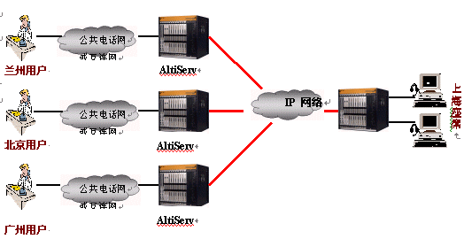 奧迪堅分布式呼叫中心方案可以分為多對多(圖1)和多對一(圖2)兩種形式,但都能夠為用戶提供本地呼叫,異地服務(wù)的功能。各個服務(wù)點之間是對等關(guān)系或隸屬關(guān)系,它們分布于不同的地理位置,在運作時間、資源、功能上互相協(xié)作,為用戶提供最大限度的服務(wù)。如果基于奧迪堅通訊系統(tǒng)的分布式呼叫中心,用戶在北京,廣州或蘭州的任何一個地方撥打本地的服務(wù)電話,都可以通過IP網(wǎng)絡(luò),自動路由到上海的坐席,由上海的坐席來為用戶提供統(tǒng)一的服務(wù),此謂多對一模式。如果北京、上;驈V州的用戶撥打本地電話后,系統(tǒng)經(jīng)過網(wǎng)絡(luò)排隊和自動路由,被分配到三個城市中任意一個正在空閑的或正適合此項服務(wù)的坐席,此謂多對多。