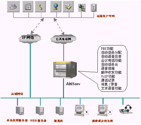 該系統(tǒng)包括 ALTISERVE®、IVR、 自動(dòng)傳真、 智能選擇坐席ACD、 來(lái)電號(hào)碼的顯示、監(jiān)督系統(tǒng)、客戶(hù)資料的查詢(xún)與錄入、查詢(xún)統(tǒng)計(jì)、現(xiàn)有資源的集成、開(kāi)放的