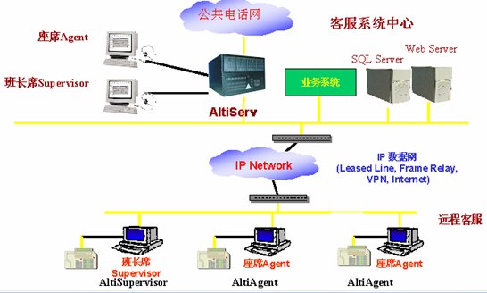 這種組合節(jié)省管理成本,因?yàn)樗械淖瘑T都在一點(diǎn),便于管理控制,同時(shí)用戶只要撥打本地電話即可進(jìn)入系統(tǒng)接收服務(wù),如需人工座席應(yīng)答的話系統(tǒng)會自動(dòng)將來電通過Internet轉(zhuǎn)接到座席員處,對公司的話費(fèi)成本也較低(都是通過Internet實(shí)現(xiàn)的長途轉(zhuǎn)接功能)。同時(shí)AltiGen也支持通過IP分機(jī)的方式遠(yuǎn)程登錄到系統(tǒng)實(shí)現(xiàn)遠(yuǎn)程座席的功能,這樣對有些高級話務(wù)員或?qū)<易,不必每天到公司上班,可以通過家里的電腦登錄到AltiGen系統(tǒng),作為系統(tǒng)的一個(gè)分機(jī)來完成所有的座席員的功能,在他的電腦屏幕上也能彈出來電人的信息。系統(tǒng)的組網(wǎng)圖如下: