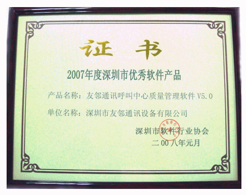 2008年3月14日,深圳市友鄰?fù)ㄓ嵲O(shè)備有限公司(以下簡稱“友鄰?fù)ㄓ崱保┬,公司主打軟件產(chǎn)品“友鄰?fù)ㄓ嵑艚兄行馁|(zhì)量管理軟件V5.0”(即 AP Suite 呼叫中心質(zhì)量管理系統(tǒng)V5.0)榮獲深圳市軟件行業(yè)協(xié)會(huì)“2007年度深圳市優(yōu)秀軟件產(chǎn)品”榮譽(yù)稱號。