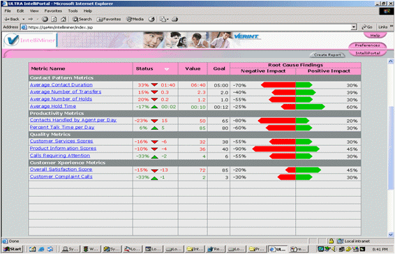 IntelliMiner使用專利的數(shù)據(jù)挖掘技術(shù),自動(dòng)分析導(dǎo)致呼叫中心關(guān)鍵行為指標(biāo)(KPI)和呼叫中心設(shè)定目標(biāo)的因素及其關(guān)系和影響。所分析的數(shù)據(jù)揭示了導(dǎo)致呼叫中心KPI表現(xiàn)的潛在原因,例如過長(zhǎng)的通話時(shí)間,過多的轉(zhuǎn)接次數(shù),過長(zhǎng)的保持時(shí)間,降低生產(chǎn)力和降低客戶滿意度。針對(duì)分析的結(jié)果,用戶可以去回放相關(guān)的呼叫,找到導(dǎo)致這些因素的原因所在。