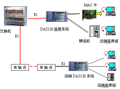 見(jiàn)下圖:DAS120主機(jī)通過(guò)4個(gè)E1接口與交換機(jī)直接連接,可方便地實(shí)現(xiàn)本地座席接入。遠(yuǎn)端分布式接入則需要通過(guò)傳輸設(shè)備,它們可為光纖,微波,HDSL等。終端可為座席卡和電話(huà)機(jī)。