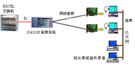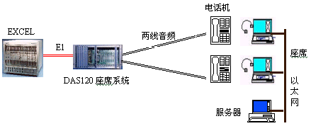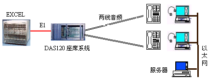 因?yàn)镋XCEL交換機(jī)不能提供模擬接口。DAS120的出現(xiàn)很好地彌補(bǔ)了其不足。它與EXCEL交換機(jī)采用4個(gè)E1連接,可以簡(jiǎn)潔實(shí)現(xiàn)PCM信號(hào)轉(zhuǎn)模擬信號(hào)引出到座席。E1接口的信令可選配為隨路信令CAS和透明通道Clear