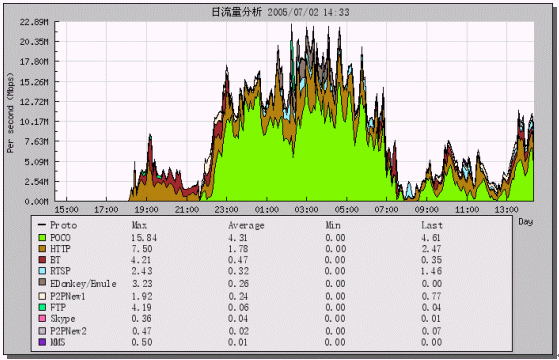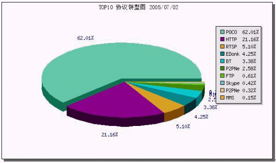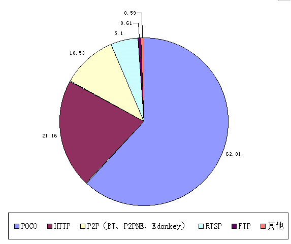 - 監(jiān)控時間段內(nèi),POCO流量占62.01%,HTTP占21.16%,RTSP(在線視頻)占5.1%,P2P業(yè)務(包括EDonkey、P2PNE、BT等)占10.53%,F(xiàn)TP為0.61%,其他業(yè)務不到0.59%。如下圖:
