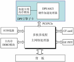 UT斯達(dá)康CCG處理刀片在通用的TC8000業(yè)務(wù)刀片上進(jìn)行了增強(qiáng),DPI采用了增強(qiáng)的64位MIPS64?多核處理器與專業(yè)ASIC芯片相結(jié)合的方案,如圖3所示。由于單純的多核處理器在密集運(yùn)算數(shù)據(jù)處理時(shí)動(dòng)態(tài)功耗會(huì)不斷增加,UT斯達(dá)康CCG解決方案中,DPI處理時(shí)會(huì)將主處理器的一部分負(fù)荷卸載到專用ASIC芯片中,來降低核心主芯片的功耗,一方面保證了主處理器在較低頻率工作時(shí)大幅降低系統(tǒng)總功耗,另一方面通過釋放主處理器提升了整個(gè)系統(tǒng)的性能。