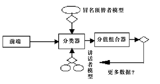 下圖說明了Nuance軟件的處理流程。語音前端處理后,分類器將講話者的語音特性和有關的講話者和冒名頂替者模型進行比較,產(chǎn)生分值。