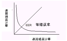 這些錯誤和兩種不同的用戶群有關。特別是,比如,0.2%的誤接納率,并不意味著0.2%的呼叫者能闖入系統(tǒng),而是0.2%的冒名頂替者企圖闖入。這比例往往只是呼叫者總數(shù)的一個零頭。安全性和方便性須得到折衷平衡。當誤接納率接近零時,誤拒絕率則上升,反之亦然。曲線上誤接受和誤拒絕率相等的點叫等錯率(ERR)。