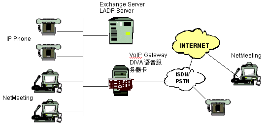 電話呼叫。在這種情況下,多于一個(gè)的電話連接可以同時(shí)在IP線路上通過(guò)數(shù)據(jù)包來(lái)傳送。通過(guò)使用G.723.1將語(yǔ)音進(jìn)行壓縮,傳送一路話音所需的帶寬將從64kbps(ISDN線路)減少到5.3kbps.如果在廣域連接中沒(méi)有足夠的帶寬或者廣域連接因?yàn)槟承┮蛟袛啵覀內(nèi)匀贿可以使用原來(lái)的PSTN來(lái)呼叫遠(yuǎn)端的辦公室。這就意味著用戶可以使用原來(lái)的服務(wù)方式而不僅僅只依賴于IP連接。所以,DIVA語(yǔ)音服務(wù)器的實(shí)施將通過(guò)提供附加的,低費(fèi)用的電話呼