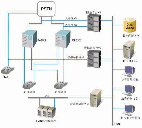 錄音系統(tǒng)還要求錄音文件統(tǒng)一保存在基于SAN結構的存儲系統(tǒng)中,并具有完備的存儲、備份功能。