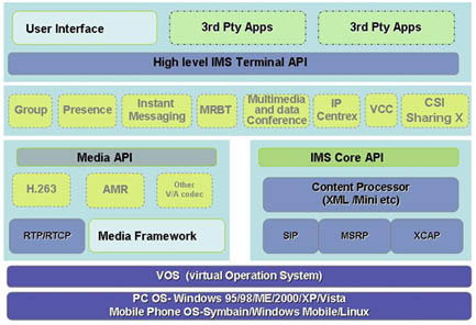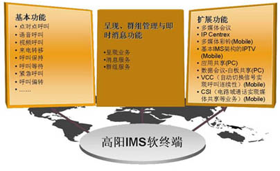 高陽IMS軟終端產(chǎn)品線是基于IMS(IP多媒體子系統(tǒng))技術(shù),以通信終端功能為主,融入IT特性,將在線狀態(tài)、即時消息和群組管理融為一體,集合語音、數(shù)據(jù)、視頻通信,提供統(tǒng)一的用戶體驗,實現(xiàn)移動電話、PC之間的互聯(lián)互通,并且符合3GPP/ETSI/OMA/IETF/ITU-T等國際標(biāo)準(zhǔn)組織和中國電信/中國移動規(guī)定的IMS相關(guān)規(guī)范。