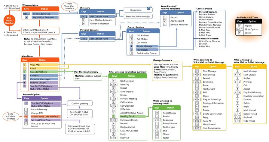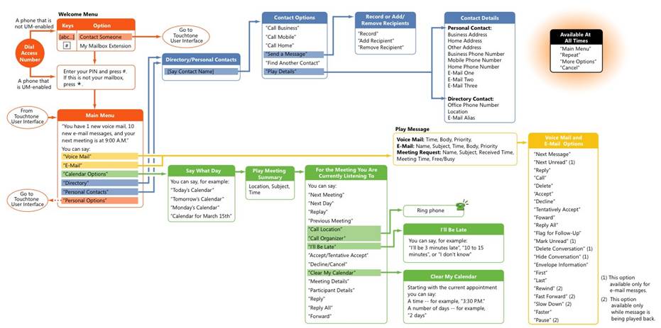 允許用戶通過(guò)電話處理他們的消息和日歷數(shù)據(jù)(包括收聽(tīng)、轉(zhuǎn)發(fā)和回復(fù)電子郵件,以及發(fā)出、更新或響應(yīng)會(huì)議請(qǐng)求)。用戶可以標(biāo)記消息以便跟蹤、跳到下一封未讀郵件、隱藏或刪除對(duì)話,甚至查找來(lái)自特定用戶的消息,這一切全都使用語(yǔ)音導(dǎo)航或標(biāo)準(zhǔn)按鍵式鍵盤(pán)來(lái)完成。