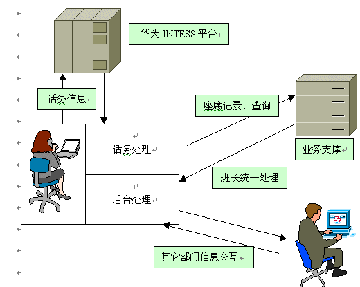 該系統(tǒng)在鐵通CRIS 平臺(tái)上運(yùn)行,前端接入采用華為CC08-A型排隊(duì)機(jī),華為INTESS平臺(tái),集成正邦高科座席軟件。完成企業(yè)業(yè)務(wù)咨詢、投訴建議的受理、產(chǎn)品訂購、外呼調(diào)查等業(yè)務(wù),并針對各業(yè)務(wù)的特色規(guī)劃了企業(yè)的業(yè)務(wù)流程。正邦高科客戶服務(wù)系統(tǒng)的坐席軟件,和華為INTESS采用緊耦合方式將話務(wù)信息和業(yè)務(wù)信息結(jié)合在一起,便于統(tǒng)計(jì)分析,制訂客戶服務(wù)中心的運(yùn)營策略。在后臺(tái)業(yè)務(wù)管理系統(tǒng)中,客戶服務(wù)系統(tǒng)設(shè)計(jì)了便于分析業(yè)務(wù)的一系列統(tǒng)計(jì)報(bào)表,使企業(yè)可以方便地對銷售過程進(jìn)行跟蹤和定單派發(fā)。