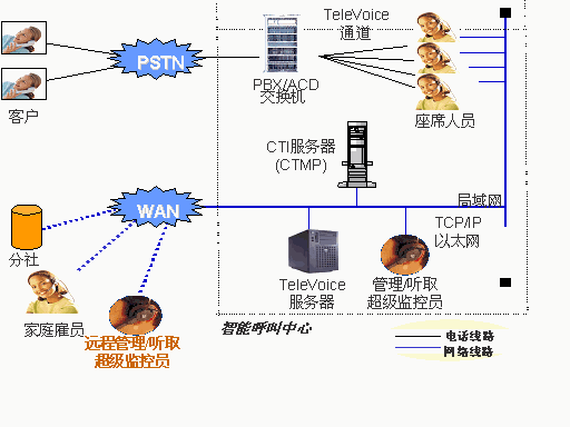 遠(yuǎn)程家庭辦公雇員支持:錄音裝備和家庭辦公雇員個(gè)人電腦之間,通過(guò)專(zhuān)用線、ADSL 或 ISDN 等, 甚至把在家進(jìn)行的通話內(nèi)容存放到總部的服務(wù)器中做錄音保存和控制