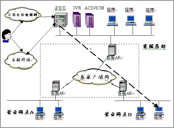 所有人工業(yè)務(wù)請(qǐng)求由總部的ACD根據(jù)客戶的開(kāi)戶營(yíng)業(yè)網(wǎng)點(diǎn)等屬性將話務(wù)分配給具有相應(yīng)服務(wù)技能和營(yíng)業(yè)網(wǎng)點(diǎn)的本地或遠(yuǎn)端座席上。