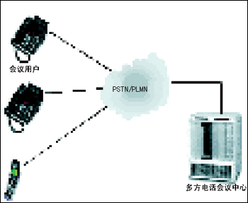目前,根據(jù)建設(shè)思路中所提到的分期實(shí)施原則,第一期只完成本地多方電話會(huì)議中心平臺(tái)的建設(shè)。參加電話會(huì)議的各方用戶均直接通過(guò)公眾電話網(wǎng)撥入中心平臺(tái),由中心平臺(tái)統(tǒng)一接入并組織會(huì)議資源為用戶服務(wù),結(jié)構(gòu)如圖2所示。
