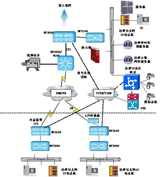 整個網絡采用了一臺MP3600企業(yè)級路由器和兩臺MP2600帶有語音模塊的路由器組建。核心路由設備由邁普MP3600模塊化路由器擔當,它直接連結上級網絡,與MP9400/9600DDN節(jié)點機構建的專網相連。在計費和呼叫管理中心采用了10M/100M的MP5100簡單網管型交換機作為網絡接入設備與核心路由設備連接,同時采用了防火墻隔離設備,以增強網絡安全系數(shù)。