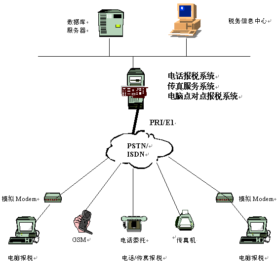 以上三種電子報稅方式,除網(wǎng)上報稅,稅務(wù)機關(guān)需通過建立專門的網(wǎng)站,配置專線接上因特網(wǎng)外,其他兩種報稅方式(即電話報稅和電腦點對點報稅),都需要用戶通過電話線撥入到稅務(wù)機關(guān),從通訊上說,這兩種方式涉及三種通訊模式,即:語音,傳真及數(shù)據(jù)通訊,為了實現(xiàn)通訊資源的共享,節(jié)省線路及設(shè)備投資,稅務(wù)機關(guān)非常希望將這三種通訊模式(語音,傳真,數(shù)據(jù))建立在一個統(tǒng)一的接入平臺中。而市場上一般的產(chǎn)品都無法做到將這三種通訊方式統(tǒng)一在一個平臺中,用戶需購買語音卡,傳真卡來滿足電話報稅的需求,購買Modem Pool和多串口卡來滿足電腦點對點報稅的需求,從而造成設(shè)備投資上的很大浪費,通訊線路資源也不能得到共享。