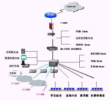 BRAS的驗證才能上網(wǎng)。校園網(wǎng)系統(tǒng)應(yīng)能覆蓋整個校園,并連接所有的學(xué)院和辦公區(qū),為大學(xué)開展現(xiàn)代化的經(jīng)營管理和辦公教學(xué)提供一個具有開放式體系結(jié)構(gòu)的計算機(jī)網(wǎng)絡(luò)系統(tǒng),具有高度的可靠性和可擴(kuò)展能力。對校園網(wǎng)內(nèi)的每一用戶(老師或?qū)W生)、閱覽室、圖書館、多媒體教室等都能夠進(jìn)行單獨(dú)的管理、計費(fèi)(時長、時段、包月、流量)、驗證、授權(quán)(瀏覽、下載、收發(fā)信件、網(wǎng)站屏蔽)、共享、帶寬分配。尤其對學(xué)生和老師區(qū)別的管理非常獨(dú)特。