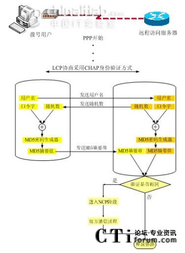 Protocol,PAP)和質(zhì)詢握手協(xié)議(Challenge Handshake Authentication Protocol,CHAP)。如果雙方協(xié)商達(dá)成一致,也可以不使用任何身份認(rèn)證方法。質(zhì)詢握手協(xié)議認(rèn)證(CHAP)相比口令驗(yàn)證協(xié)議認(rèn)證(PAP)安全性更高,因?yàn)镃HAP不在線路上發(fā)送明文密碼,而是發(fā)送經(jīng)過(guò)摘要算法加工過(guò)的隨機(jī)序列,也被稱為"挑戰(zhàn)字符串".如下圖所示。