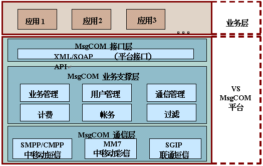 MsgCOM是Voicesoft專門為移動內(nèi)容提供商或企業(yè)開發(fā)的移動通信平臺,它支持SMS短信(SMPP/CMPP)、MMS彩信(MM7)、聯(lián)通短信(SGIP)等等通信協(xié)議,同時提供對各種業(yè)務支持的業(yè)務支持層,為各種業(yè)務提供了簡單靈活的業(yè)務二次開發(fā)接口;MsgCOM屏蔽了所有的底層通信協(xié)議和復雜的業(yè)務管理、計費管理、用戶管理等等內(nèi)容,為用戶提供了一個簡單、高層、靈活的業(yè)務定制接口,便于內(nèi)容提供商和企業(yè)定制自己的移動應用,MsgCOM將具有廣泛應用市場,歡迎各大系統(tǒng)集成商、移動內(nèi)容提供商、知名企業(yè)來電來函進行合作。