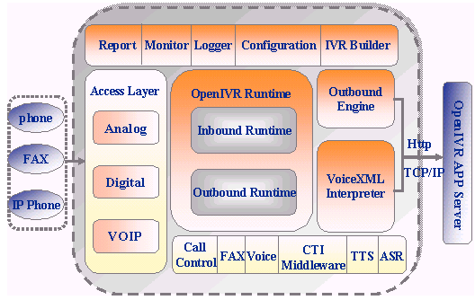 OpenIVR通過了業(yè)界主要的CTI中間件和PBX集成測試,是呼叫中心系統(tǒng)IVR服務(wù)器的理想選擇;而集成商只需簡單掌握VoiceXML語言,就可以方便地定制業(yè)務(wù)及流程;下面是 OpenIVR系統(tǒng)結(jié)構(gòu)圖: